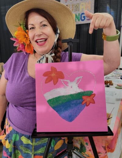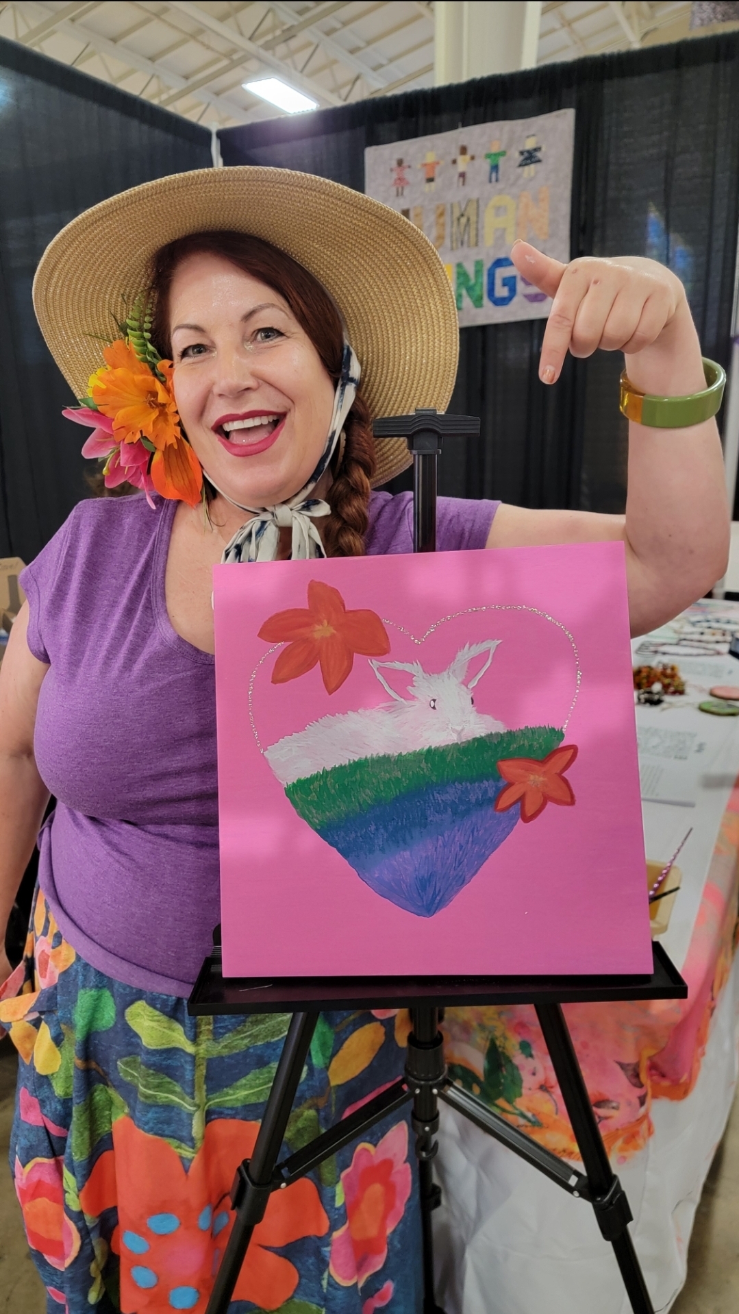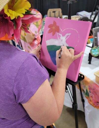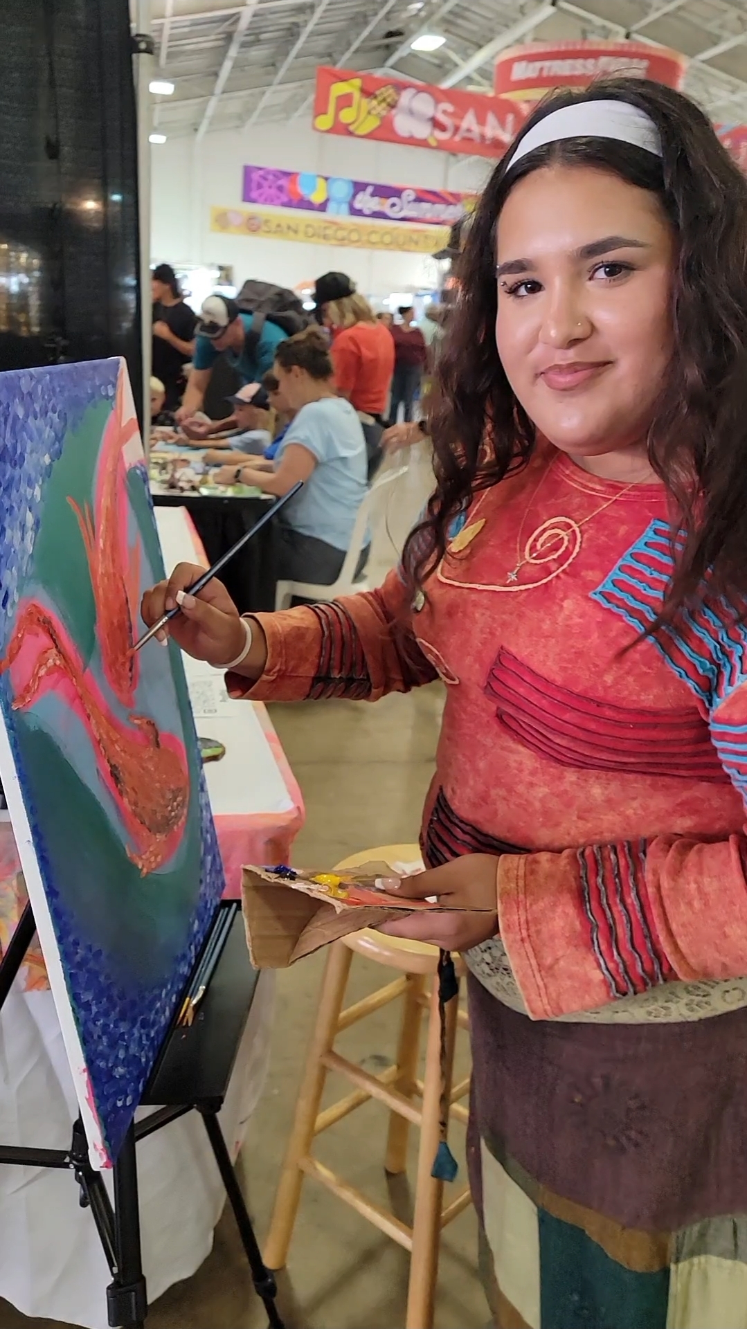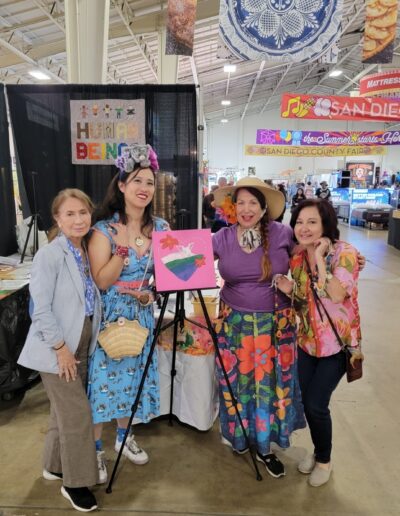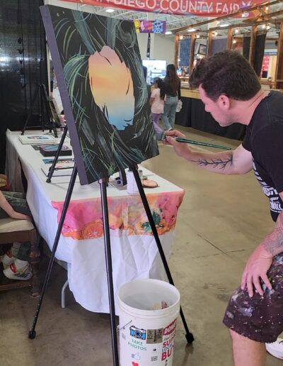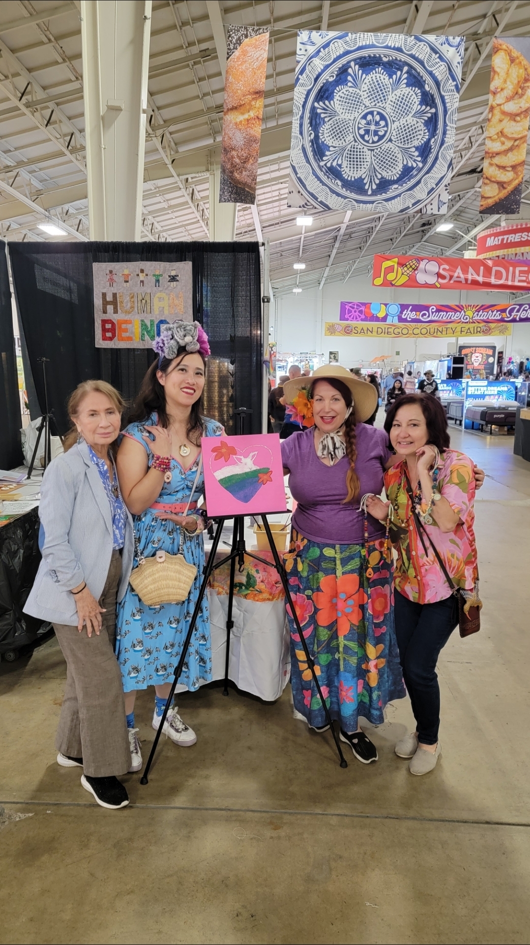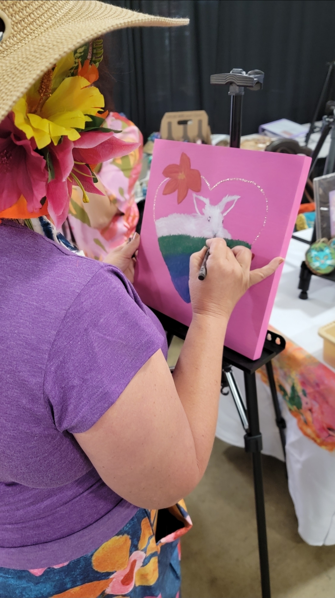 This year at the San Diego County Fair’s Summer Petacular, Charity Wings hosted two booths at the Home Arts and Hobbies section on June 21st and 22nd, 2025. On Saturday, Michael Carini of Carini Arts painted in his signature style live to the delight of the fairgoers in the Home Arts and Hobbies Area. Alessandra Thornton of Allie Tagua Jewelry crafted her beautiful eco friendly jewelry and Michelle Penick live painted a portrait of a rabbit from Zooh Corner Rabbit Rescue. Jonathan and our other volunteers, Dale, Meg and Lisa hosted a free make and take. Our good friends the SD Tiki Ladies came out to support Allie, Jennifer and Michelle on Saturday Afternoon. On Sunday, local student, Scarlet Mohi volunteered to paint a live painting of koi fish, and Jennifer painted a live portrait of a french bulldog and Harley from @EatDrinkCat on Instagram. Jonathan helped people to do a free custom 1 inch button for a free make and take. Artist Sheryl Schroder also provided some hand painted ornaments for the cause. Founder Elena and Devin came to support us as well! We raised money for animals affected during the LA Wildfires of 2025.